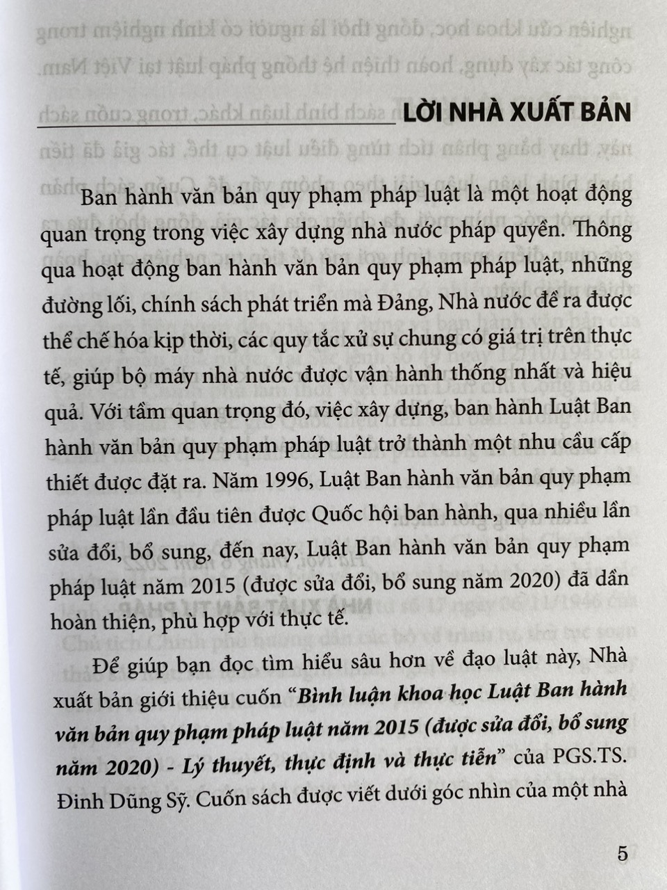 Tác giả: PGS.TS. Đinh Dũng Sỹ Ban hành văn bản quy phạm pháp luật là một hoạt động quan trọng trong việc xây dựng nhà nước pháp quyền. Thông qua hoạt động ban hành văn bản quy phạm pháp luật, những đường lối, chính sách phát triển mà Đảng, Nhà nước đề ra được thể chế hóa kịp thời, các quy tắc xử sự chung có giá trị trên thực tế, giúp bộ máy nhà nước được vận hành thống nhất và hiệu quả. Với tầm quan trọng đó, việc xây dựng, ban hành Luật Ban hành văn bản quy phạm pháp luật trở thành một nhu cầu cấp thiết được đặt ra. Năm 1996, Luật Ban hành văn bản quy phạm pháp luật lần đầu tiên được Quốc hội ban hành, qua nhiều lần sửa đổi, bổ sung, đến nay, Luật Ban hành văn bản quy phạm pháp luật năm 2015 (được sửa đổi, bổ sung năm 2020) đã dần hoàn thiện, phù hợp với thực tế. Để giúp bạn đọc tìm hiểu sâu hơn về đạo luật này, Nhà xuất bản giới thiệu cuốn “Bình luận khoa học Luật Ban hành văn bản quy phạm pháp luật năm 2015 (được sửa đổi, bổ sung năm 2020) - Lý thuyết, thực định và thực tiễn” của PGS.TS. Đinh Dũng Sỹ. Cuốn sách được viết dưới góc nhìn của một nhà nghiên cứu khoa học, đồng thời là người có kinh nghiệm trong công tác xây dựng, hoàn thiện hệ thống pháp luật tại Việt Nam Khác với những cuốn sách bình luận khác, trong cuốn sách này, thay bằng phân tích từng điều luật cụ thể, tác giả đã tiến hành bình luận, luận giải theo nhóm vấn đề. Cuốn sách phản ánh một góc nhìn mới, đa chiều của tác giả, đồng thời đưa ra các quan điểm mang tính gợi mở để tiếp tục nghiên cứu, hoàn thiện pháp luật. Dù tác giả đã dành sự tâm huyết và cố gắng trong quá trình biên soạn, nhưng cuốn sách khó tránh khỏi những thiếu sót nhất định.