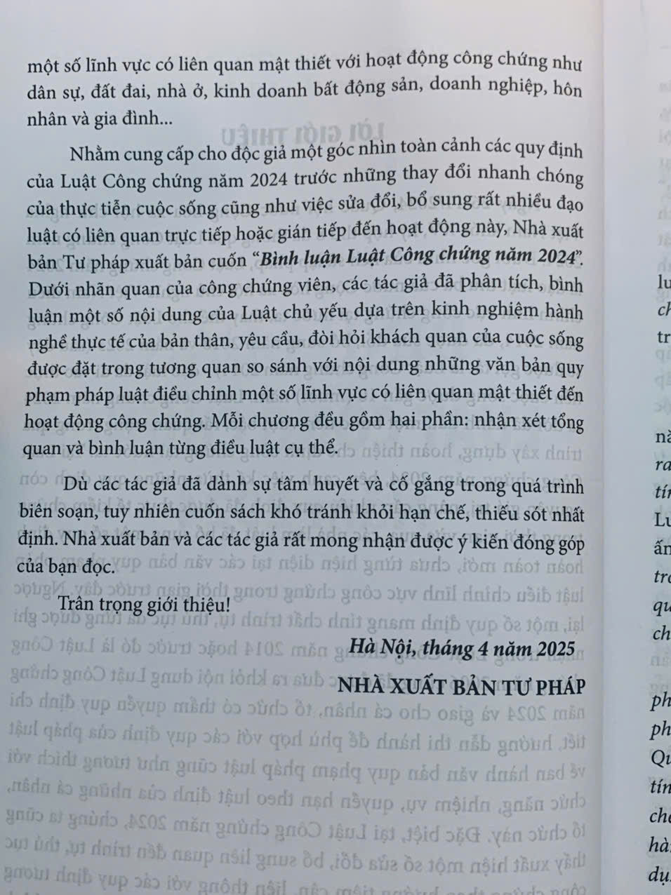 Nhằm cung cấp cho độc giả một góc nhìn toàn cảnh các quy định của Luật Công chứng năm 2024 trước những thay đổi nhanh chóng của thực tiễn cuộc sống cũng như việc sửa đổi, bổ sung rất nhiều đạo luật có liên quan trực tiếp hoặc gián tiếp đến hoạt động này, Nhà xuất bản Tư pháp xuất bản cuốn “Bình luận Luật Công chứng năm 2024”. Dưới nhãn quan của công chứng viên, các tác giả đã phân tích, bình luận một số nội dung của Luật chủ yếu dựa trên kinh nghiệm hành nghề thực tế của bản thân, yêu cầu, đòi hỏi khách quan của cuộc sống được đặt trong tương quan so sánh với nội dung những văn bản quy phạm pháp luật điều chỉnh một số lĩnh vực có liên quan mật thiết đến hoạt động công chứng.