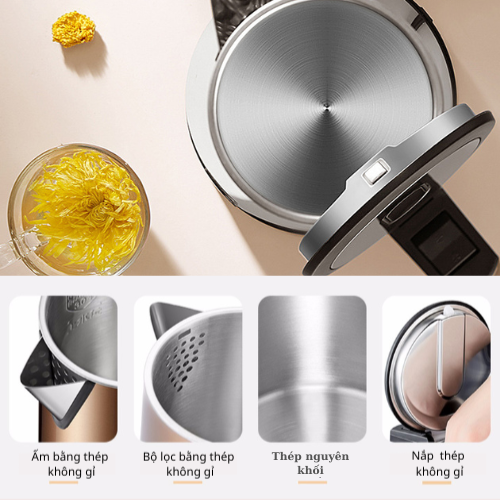 Dung tích: 1.7L Công suất: 1800W Ưu điểm nổi bật: 2 lớp cách nhiệt: Thép không gỉ bên trong, nhựa mát tay bên ngoài – an toàn tuyệt đối, nhất là với gia đình có