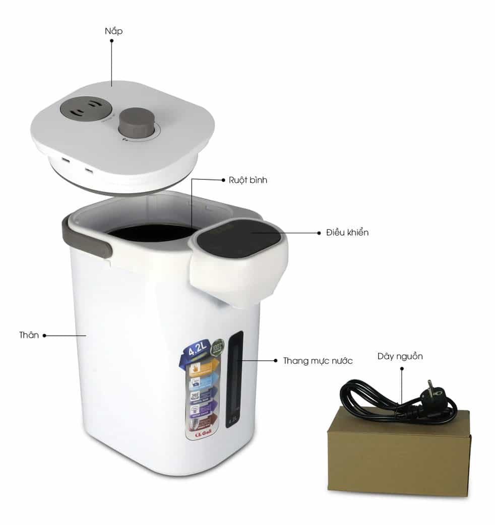 - Sản phẩm bao gồm: 1 bình đun 4.2 lít, 1 dây nguồn, 1 hdsd và phiếu bảo hành 2 năm.