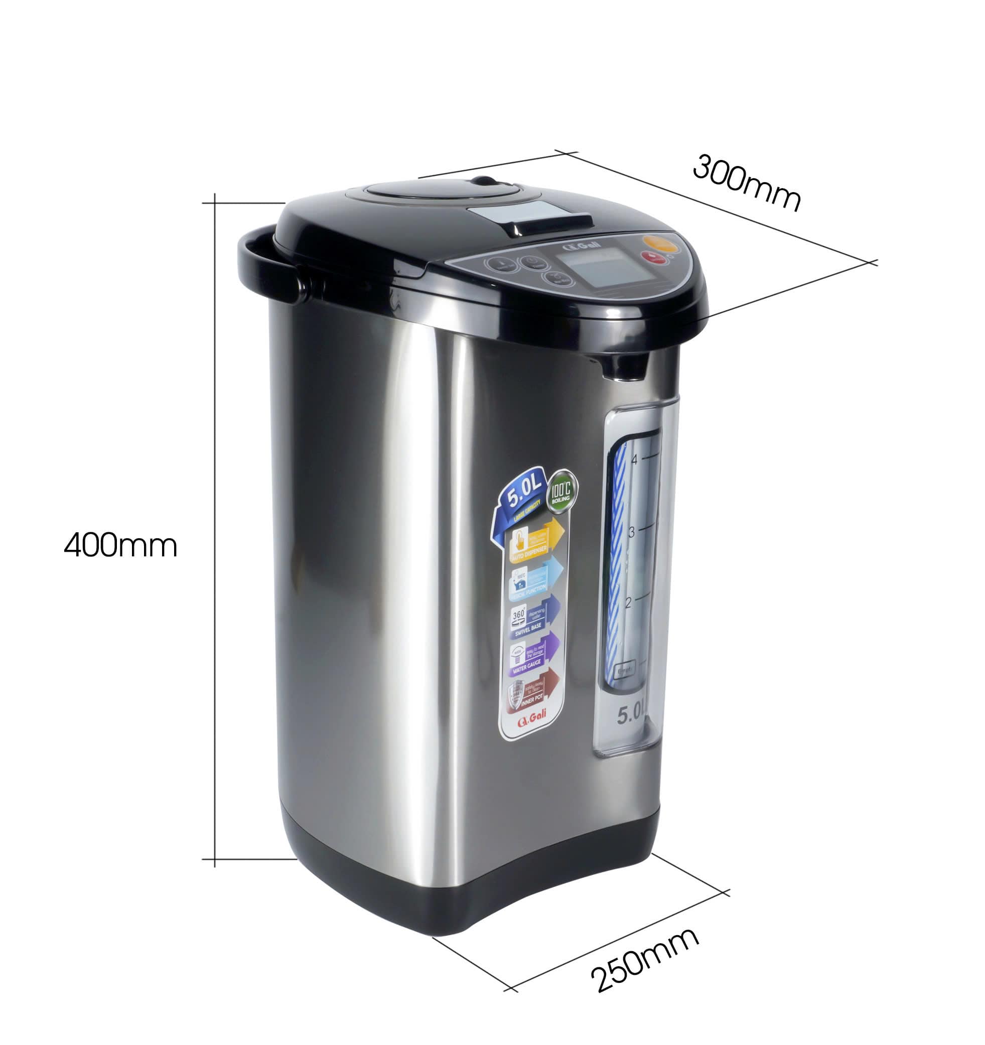 Bình thủy điện Gali GL-5050B 5 Lít - Dung tích 5 lít, công suất 680w/220Vac50Hz. - Cấu tạo 2 lớp chống nóng, vỏ ngoài inox sang trọng, thân trong inox 304 không phôi nhiễm, an