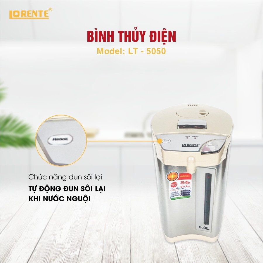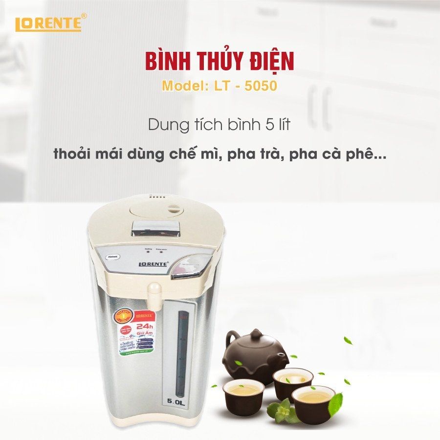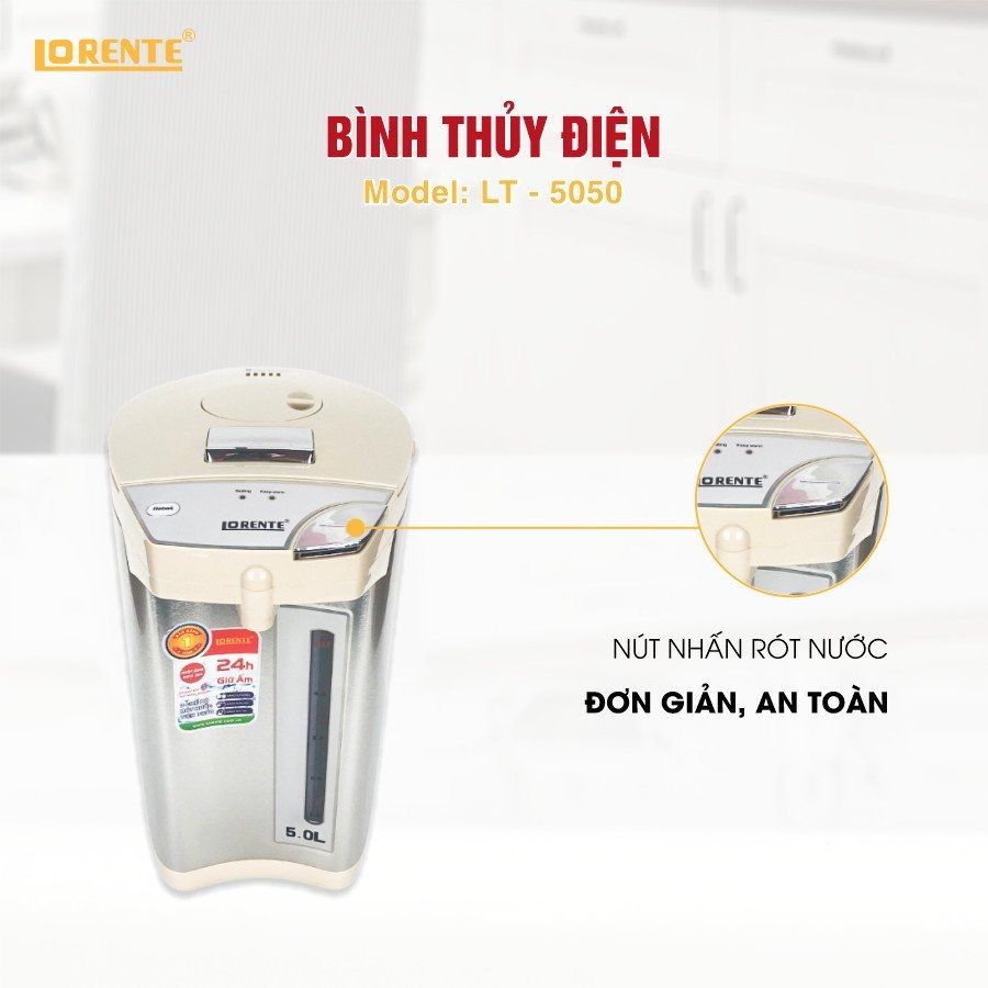 Bình Thủy Điện Lorente LT5050 sở hữu thiết kế đẹp mắt, sang trọng cùng dung tích lớn, thích hợp sử dụng trong gia đình đông người.
