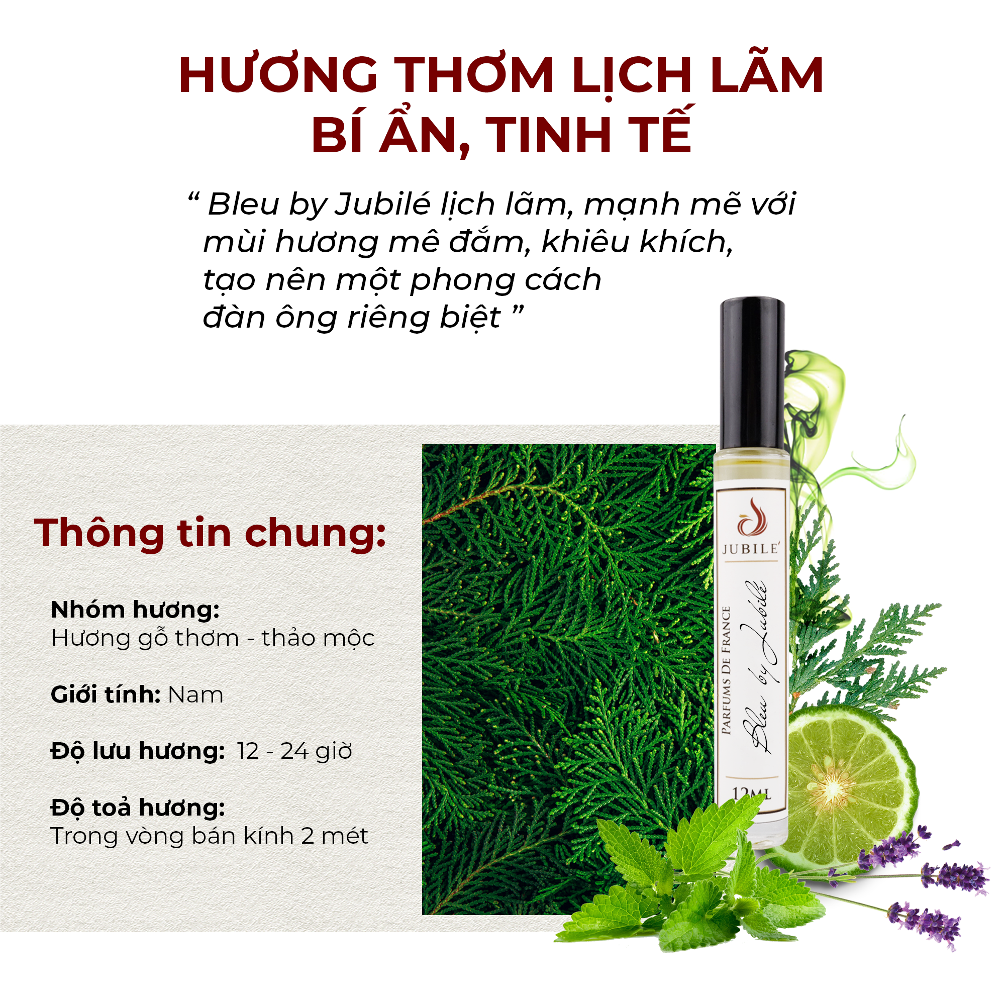 - Có thể nói, Tinh dầu nước hoa thơm lâu Bleu by Jubilé là sự kết hợp của những nguyên liệu lạ lẫm mang trong mình phong cách hương thơm bí ẩn, lịch lãm. Nó chẳng những khiến cho người ta tò mò mà còn bị thu hút một cách mãnh liệt bởi hương thơm lịch lãm và đầy nam tính.