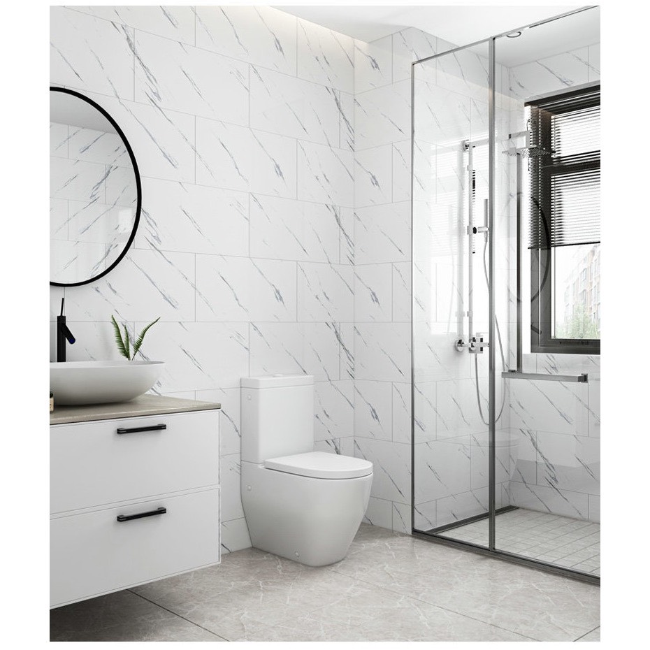 Mẫu giấy dán tường giả đá hoa cương màu trắng này có sẵn keo rồi, khách chỉ cần lột ra dán thôi. Chất liệu bền đẹp, không bám bụi, có thể lau chùi bằng xà