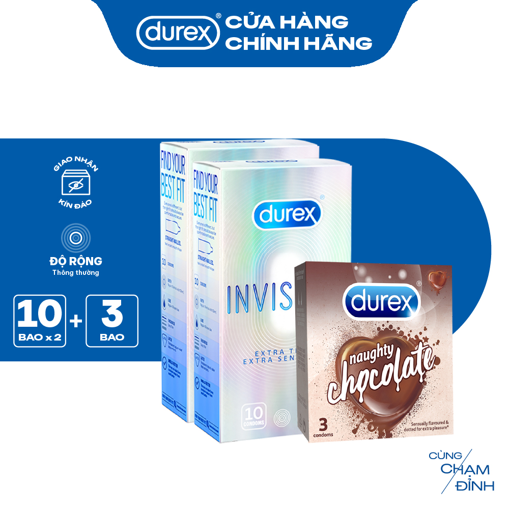 ✨Bộ 2 hộp bao cao su Durex Invisible siêu mỏng (52mm, 10 bao/hộp)+ 1 Durex Naughty Chocolate hương choco (52mm, 3 bao/hộp)