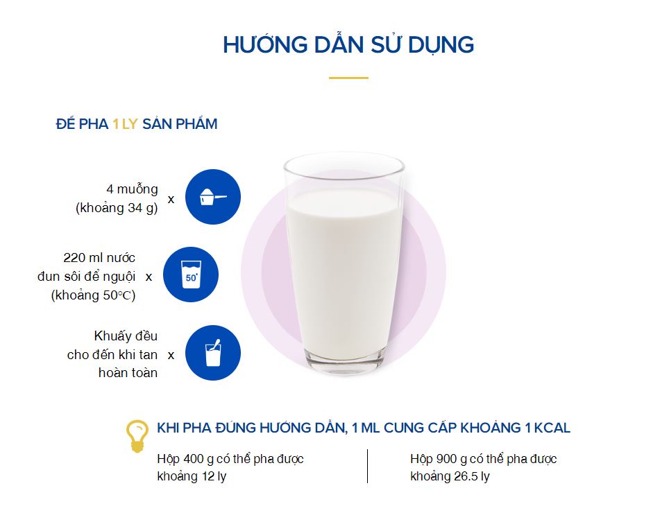 Giá trị dinh dưỡng trung bình Trong 100g bộtTrong 1 ly đã phaĐơn vịNăng lượng420160kCalChất béo248,2gMCT2,50,85mgChất đạm19,36,6gHydrat Carbon43,214,7gĐộ ẩm30gKhoáng chất Natri26088mgKali980333mgClorid490167mgCanxi720245mgPhốt pho540184mgMagiê5820mgKẽm2,40,82mgĐồng0,350,05mgVitamins Vitamin A1800612I,UVitamin D37,22,45I,UVitamin C9,13,1mgVitamin B10,20,07mgVitamin B21,40,48mgAcid folic35,812,2mcgAcid pantothenic1,30,44mgVitamin B121,80,61mcgBiotin20,77,04mcgCholin15659,3