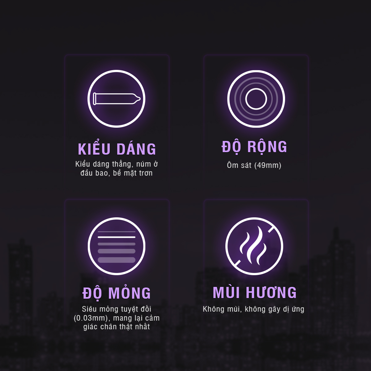 Dung tích: 08 cái / hộp Xuất xứ: NHẬT BẢN Kiểu dáng: hiện đại, ôm sát, vừa vặn, siêu mỏng. Kích thước: 52 +-2mm Độ dày: 0.03mm Mùi: Không mùi, tinh khiết. MÔ TẢ Bao cao