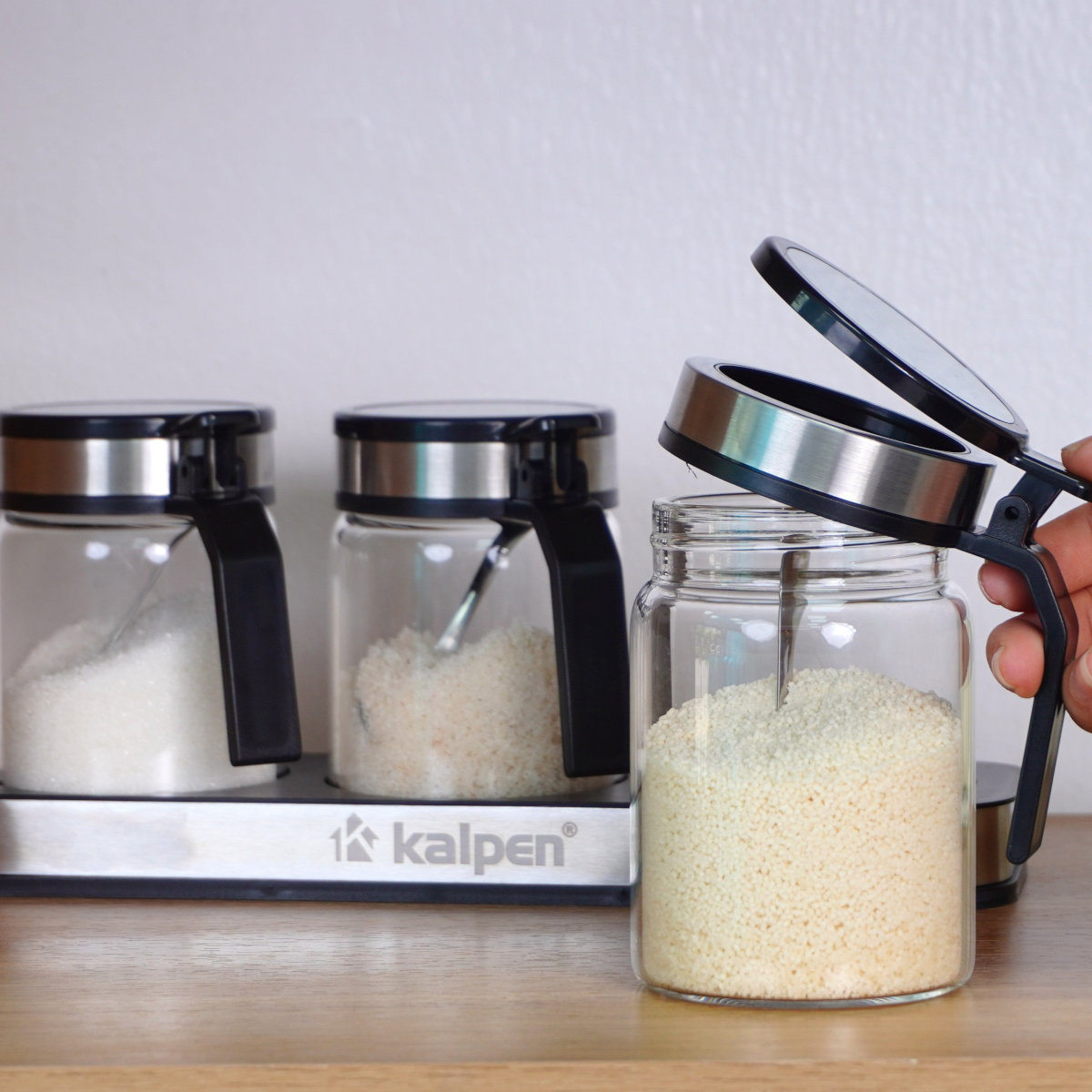 Bộ 3 hộp gia vị Kalpen SB2 – thủy tinh cao cấp, nắp inox chống ẩm, tiện lợi, bền đẹp, bếp gọn gàng.