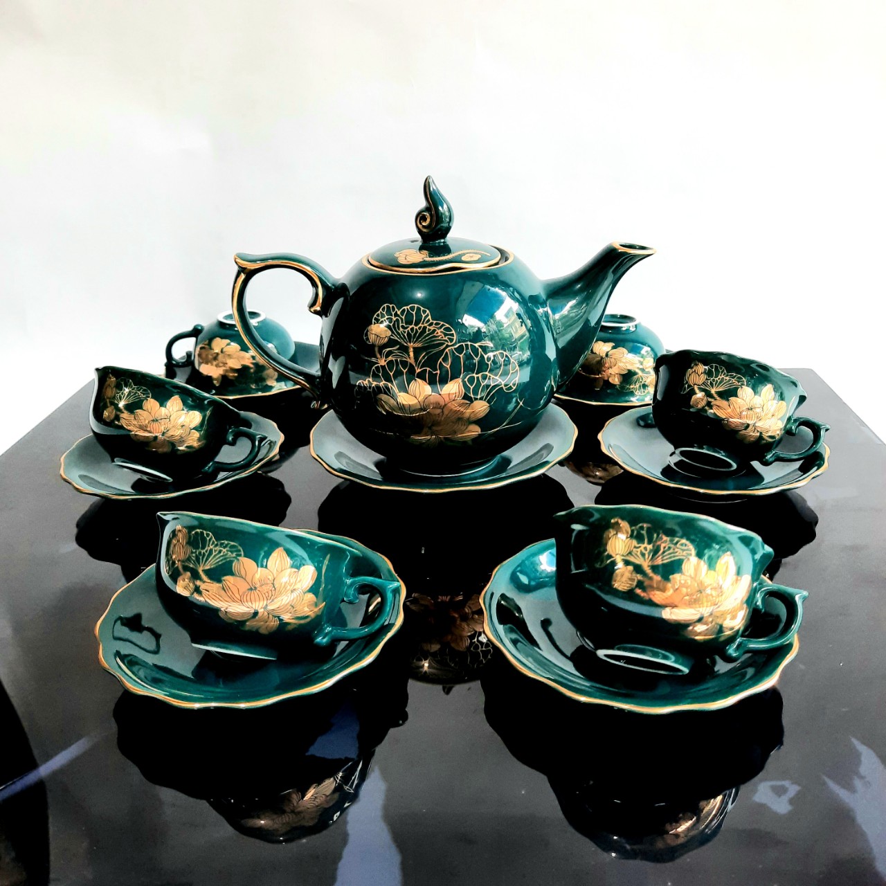✨Bộ ấm chén Bát Tràng cao cấp phú quý Mallard màu xanh Arctic họa tiết hoa sen vẽ vàng 24k