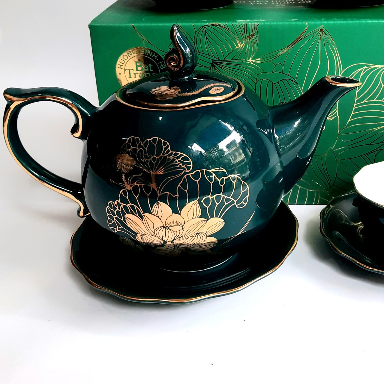 Bộ Trà Sứ Mạ Vàng Men Ngọc Trai Tiệp Khắc Cao Cấp Hàng chính hãng  Bộ ấm chén tử sa tròn khắc hoa Sen gốm sứ Bát Tràng (bộ bình uống trà, bình trà)