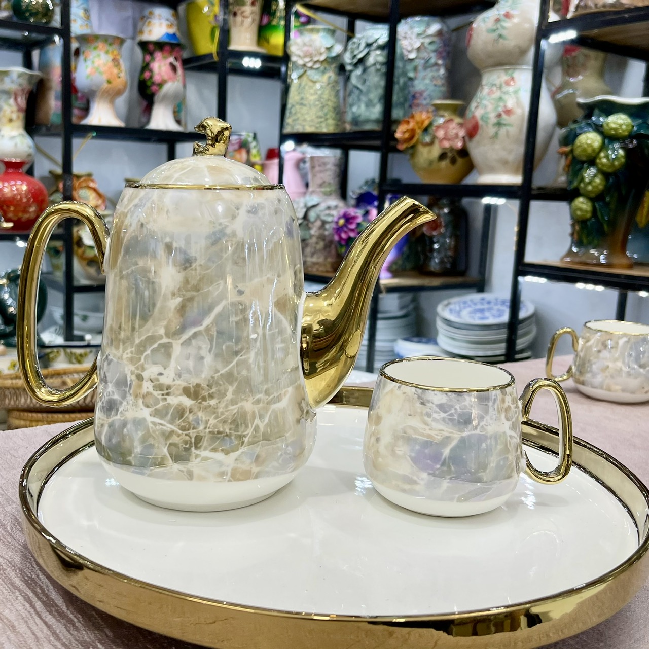 ✨Bộ ấm chén, bình trà cao cấp men vân đá viền mạ vàng 24k đế xoay 360d