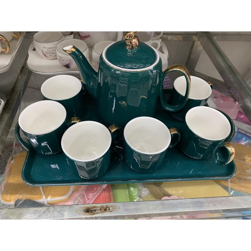 Bộ ấm chén sứ, bộ tách pha trà cà phê cao cấp màu xanh cổ vịt họa tiết hươu vàng