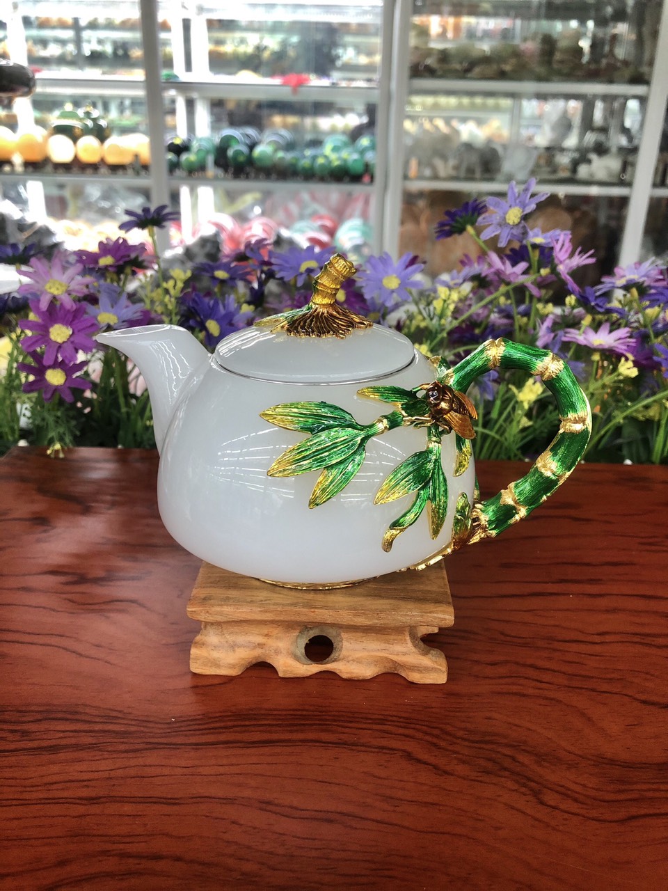 ✨Bộ ấm trà chạm hình cây tre với ly chạm chữ đá bạch ngọc