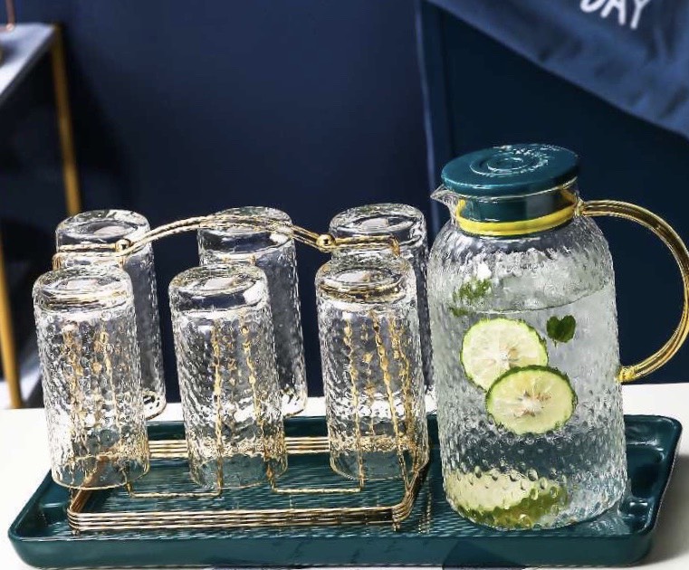 Bộ sản phẩm gồm: 1 bình thủy tinh vân nhám đựng nước + 6 cốc sứ + 1 khay + 1 giá treo cốc