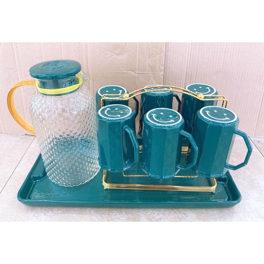 Bộ bình rót nước kèm 6 cốc sứ giá gỗ xanh ngọc bích sang trọng - Quatructuyen.com