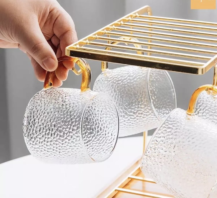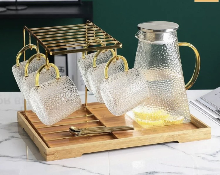 ✨BỘ BÌNH ĐỤNG NƯỚC UỐNG THỦY RINH ĐÁY VUÔNG VÂN DẬP NỔI KÈM 6 CỐC BẦU, KHAY VÀ GIÁ TREO CỐC -VD107