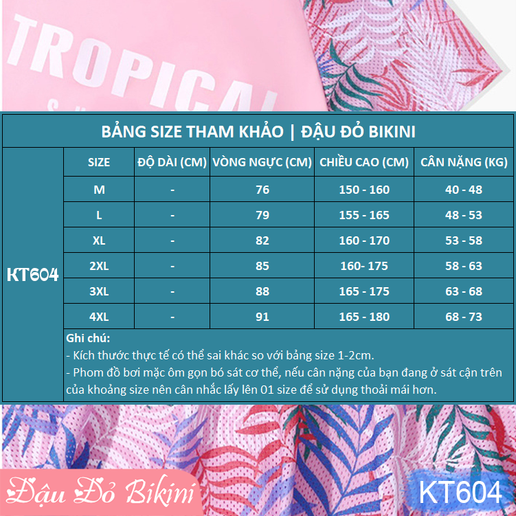 - Size Nữ (tùy chiều cao): One Size cho cân nặng từ 38-50Kg - Màu chủ đạo: Nhiều màu và mẫu theo lựa chọn của khách hàng. - Thiết kế hai mảnh, có sẵn mút