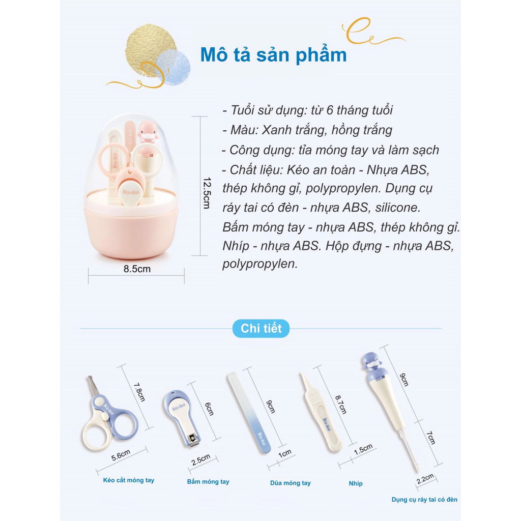 Bộ sản phẩmKUKU với đầy đủ các vật dụng cần thiết, tiện dụng cho Mẹ chăm sóc cho bé : 1 kéo cắt móng tay, 1 bấm móng tay, 1 dũa móng tay, 1 dụng cụ