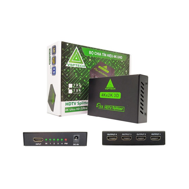 HDTV SPLITTER VER 1.44K-Utra HD Chia 1 tín hiệu đều vào ra 4 tín hiệu HDHI Tương thích tất cả thiết bị chuẩn HD và audio HD Tương thích HDCP và các chuẩn nén và giải mã âm thanh DTS, Dobby, 7.1 Channel Audio Product: 1 port HDTV Splitter HDTV Source inport: 1 Display device outport: 2 Source port connector: 19 pin HDTV Source Device port conector: 19 pin HDTV HDCP compliant: yes Device port LED: yes 4 Videlbandwidth: up to 4,95GHz Vertical fraquency range: 60/85Hz Power consumption (max): 5 Watts HDTV ver: 1,4