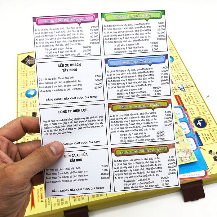 - Bộ sản phẩm gồm: các thẻ, quân cờ, bàn cờ bằng giấy, tiền, nhà,