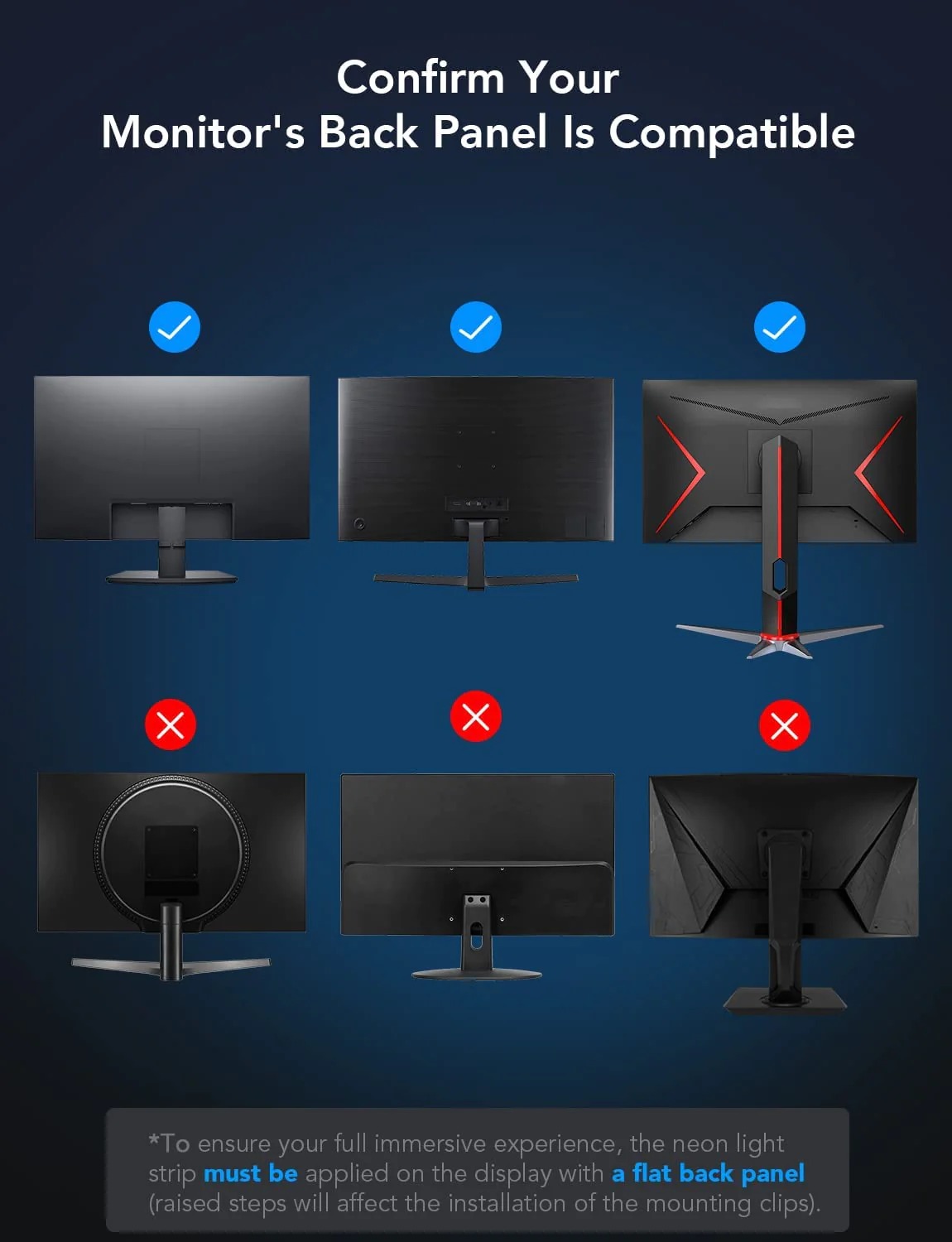 Để đảm bảo trải nghiệm đắm chìm đầy đủ của bạn, dải đèn neon phải được gắn trên màn hình với mặt sau phẳng (các bậc nâng lên sẽ ảnh hưởng đến việc lắp đặt các kẹp gắn).
