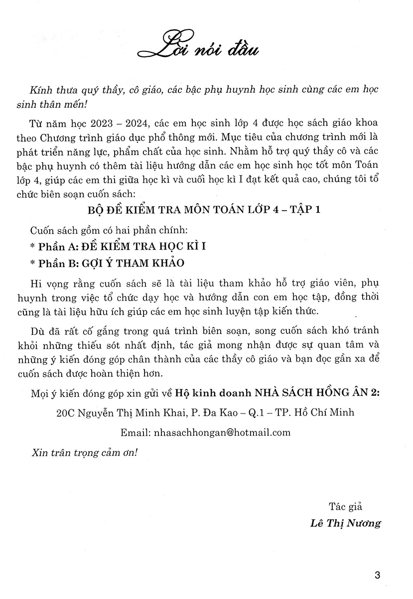 Từ năm học 2023 – 2024, các em học sinh lớp 4 được học sách giáo khoa theo Chương trình giáo dục phổ thông mới. Mục tiêu của chương trình mới là phát triển năng lực, phẩm chất của học sinh. Nhằm hỗ trợ quý thầy cô và các bậc phụ huynh có thêm tài liệu hướng dẫn các em học sinh học tốt môn Toán lớp 4, giúp các em thi giữa học kì và cuối học kì I đạt kết quả cao, chúng tôi tổ chức biên soạn cuốn sách: BỘ ĐỀ KIỂM TRA MÔN TOÁN LỚP 4 - TẬP 1.
