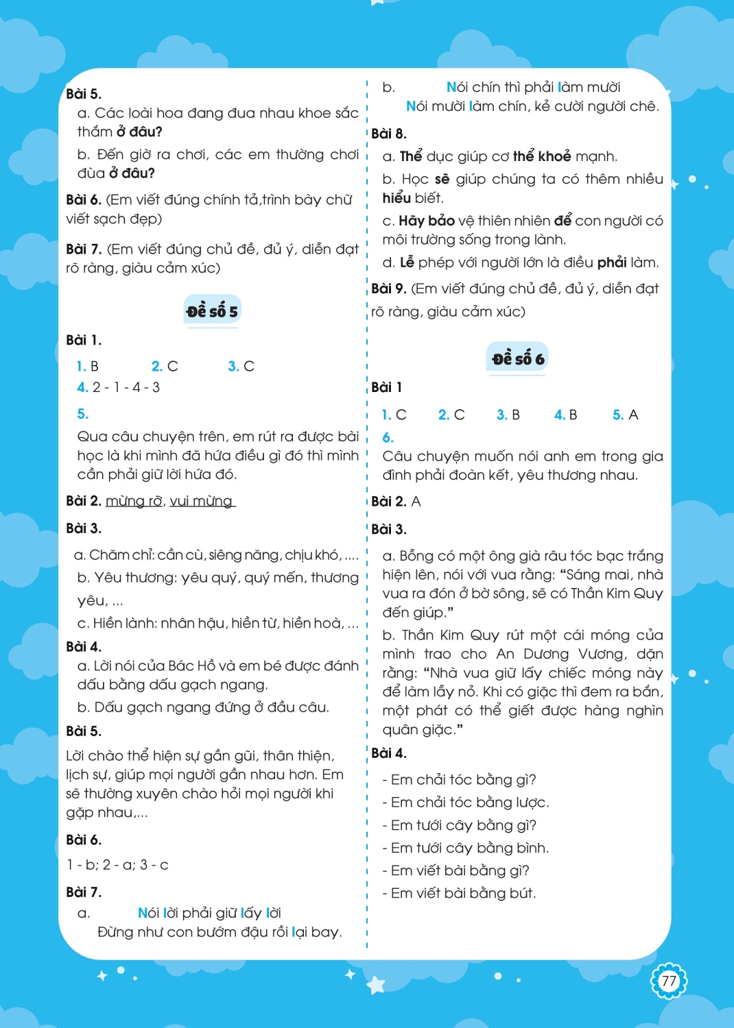 - Sách được chia thành 2 phần rất dễ hiểu cho các bé: Phần đề ôn tập và Phần đề kiểm tra. Phần đề ôn tập: Gồm 18 đề được chia theo các chủ điểm, hoặc chia thành các đề ôn tập theo sát chương trình học trên lớp theo giai đoạn. Phần đề kiểm tra: Gồm 5 đề kiểm tra cuối học kỳ để kiểm tra, đánh giá kiến thức tổng hợp của học sinh.