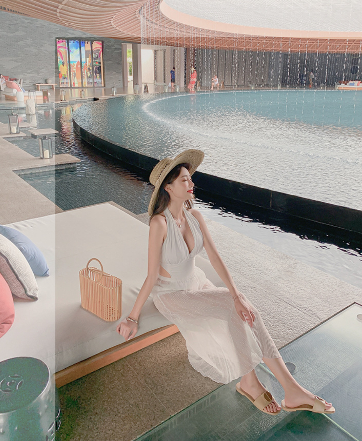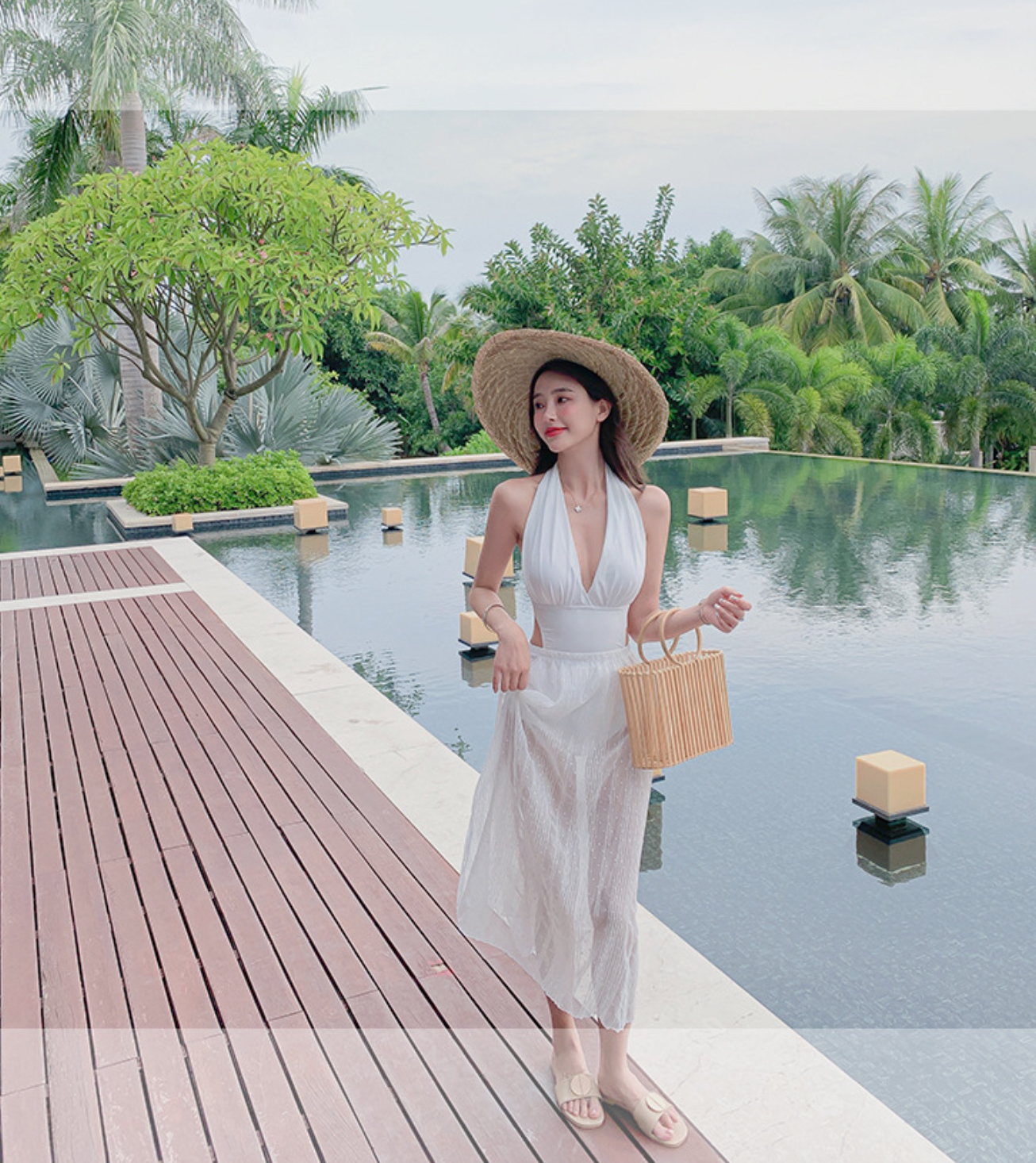 - Chất vải nhung tuyết mềm, co giãn tốt, mặc vừa ôm sát mà vẫn tạo sự mềm mại. - Đồ bơi trắng nhưng nhờ dáng váy chữ A xoè nên mặc sẽ cực kì