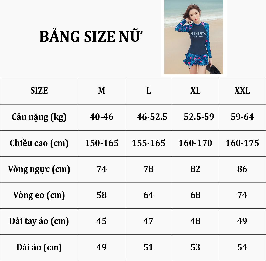 Mua tại TiktokĐồ bơi cho nữ dài tay, chân váy liền quần. Có 2 màu: Xanh đen và màu đen. Sản phẩm không bao gồm nón Thành phần vải: Chất liệu thun cao cấp: 87% Nylon; 13% Spandex Thành phần vải lót: 100% sợi Polyester Các tính năng: Vải bền và chắc chắn; Co giãn, đàn hồi tốt. Chống ánh nắng chiếu trực tiếp, bảo vệ da; Giữ nhiệt tốt, không bị lạnh khi bơi. Không hút, thấm nước và rất nhanh khô. Quyết định chọn size: Để lựa chọn size một cách chính xác các mẹ dựa vào các thông số cơ bản sau: Cân nặng (kg), Vòng ngực (cm), Vòng eo (cm), Chiều cao (cm)…