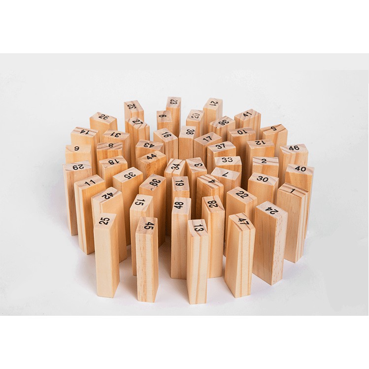 - Bộ sản phẩm gồm 48 thanh gỗ và 1 hột xí ngầu với rất nhiều màu sắc rực rỡ.