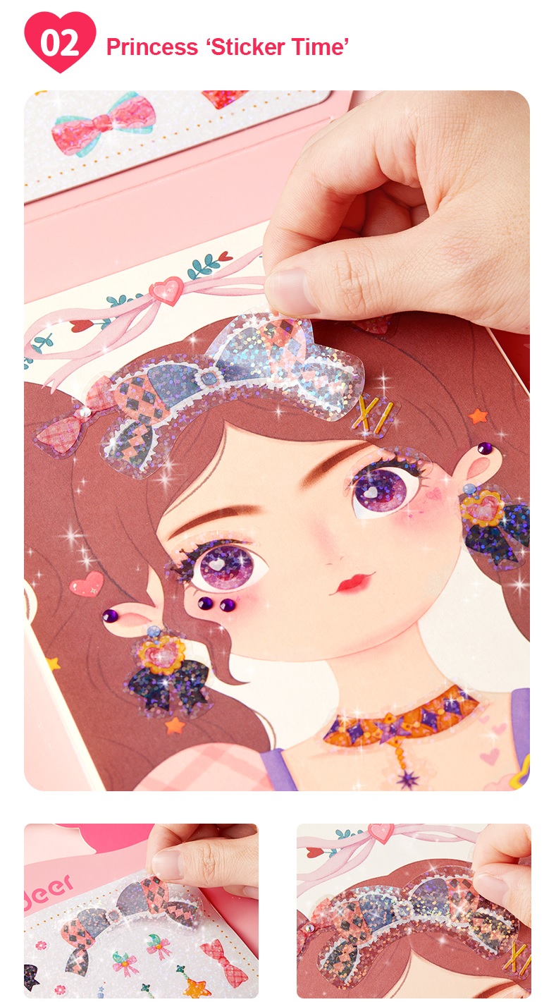 Bộ trang điểm Mideer bao gồm: 20 mẫu trang điểm công chúa, 4 mẫu nhãn dán kim cương, 4 mẫu nhãn dán sáng bóng, 4 nhãn dán, 6 màu, 900 viên kim cương, 10 chất liệu vải, 1 tấm, 1 bút đính cương, 1 keo dán, 2 cọ trang điểm
