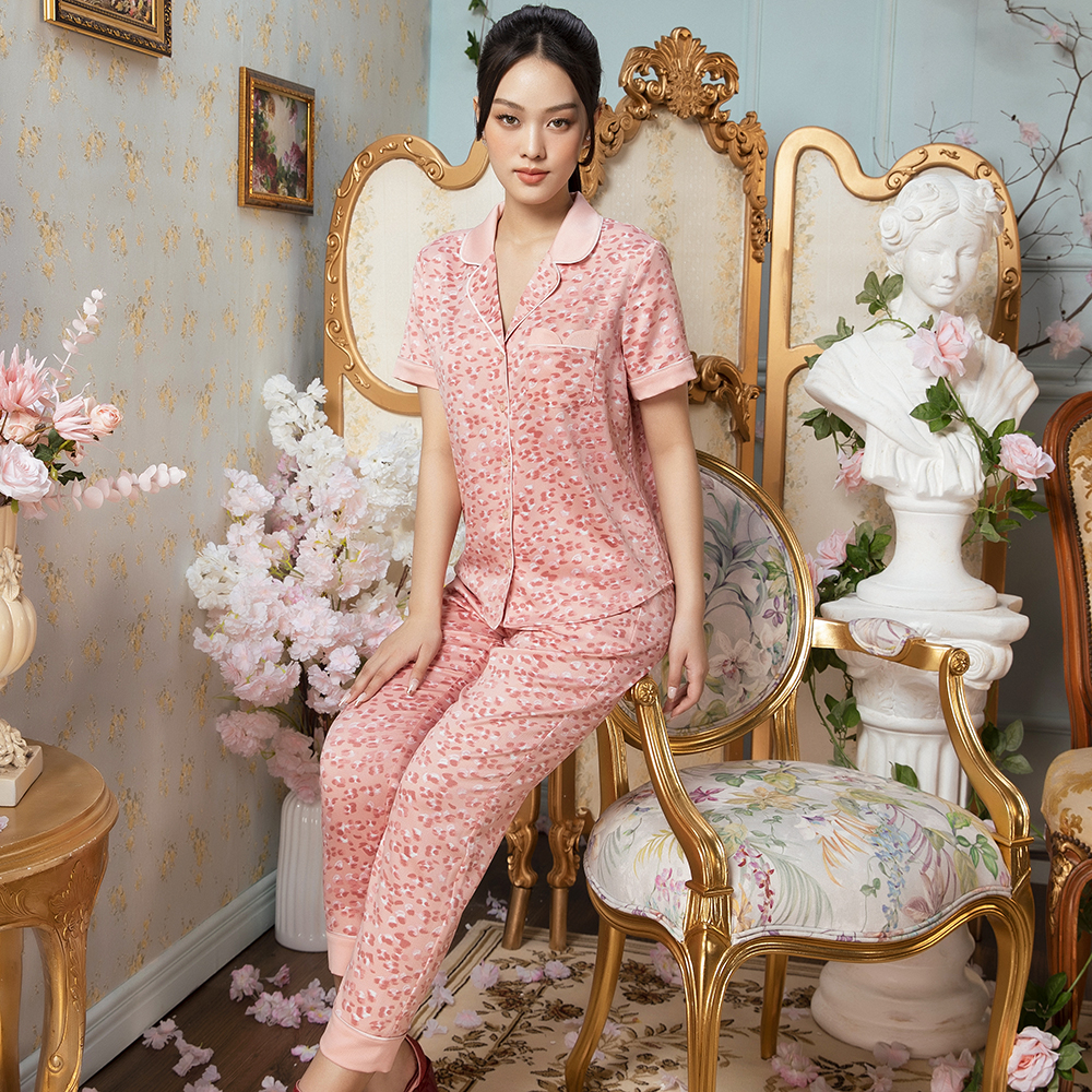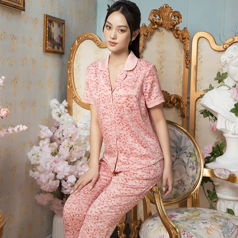 Bộ satin dài form basic, áo tay ngắn phối satin trơn và viền mí