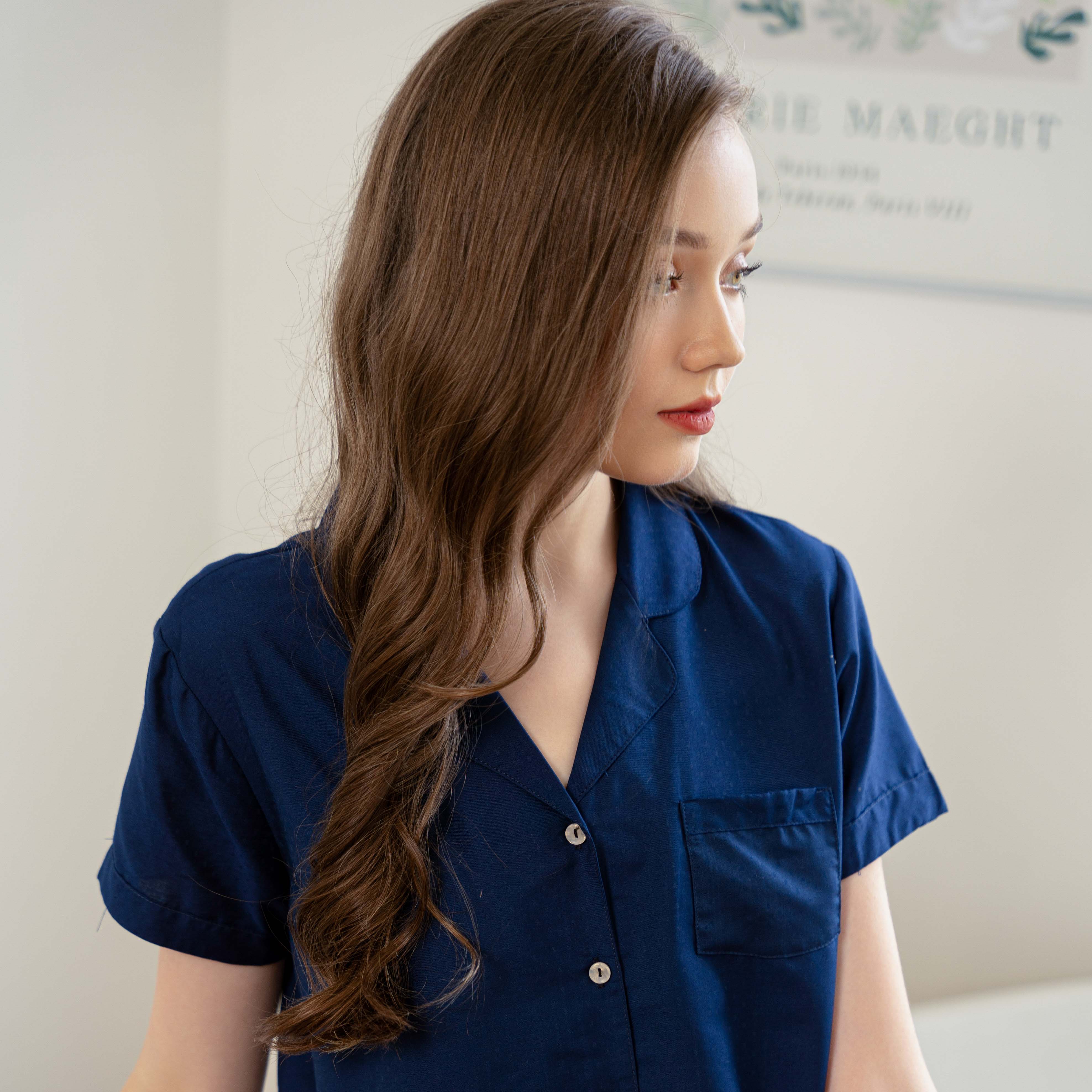 Áo Pijama LMcation có tay ngắn, cổ áo bo vừa vặn, kết hợp túi trước ngực và được phối viền độc đáo. Dễ dàng phối với bất kỳ quần loại quần mặc nhà nào với