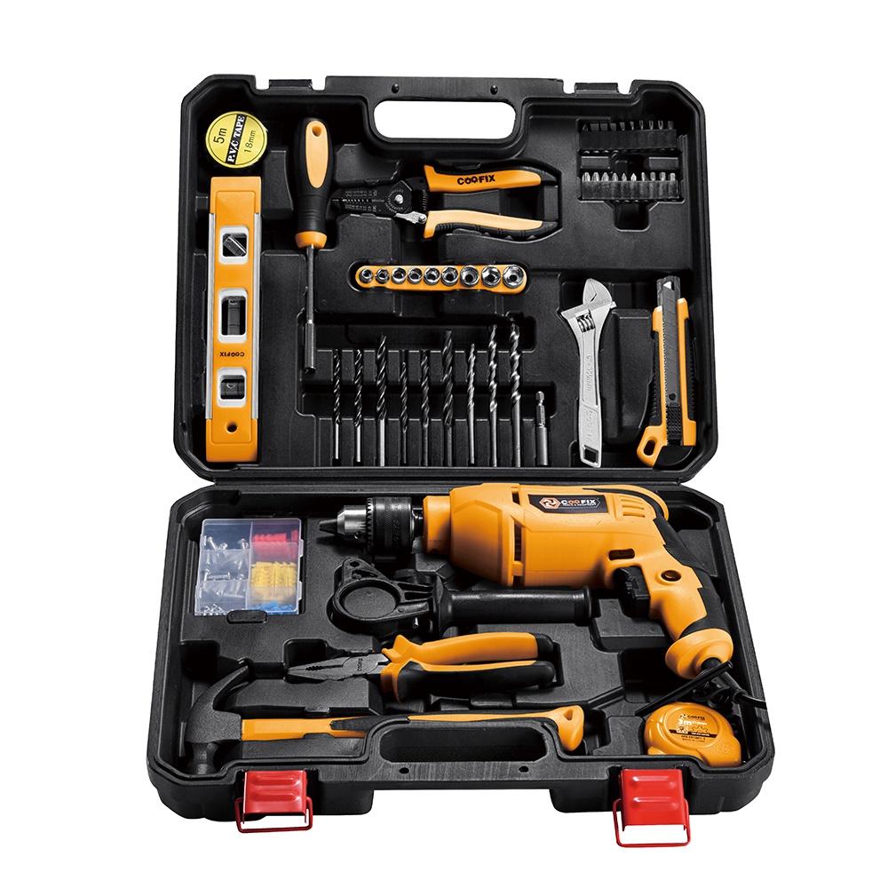 Coofix CF-IDK001 gồm máy khoan cầm tay, thước thủy, kìm, mũi khoan, mũi vít, dao cắt, tay cầm phụ, búa, thước cuộ