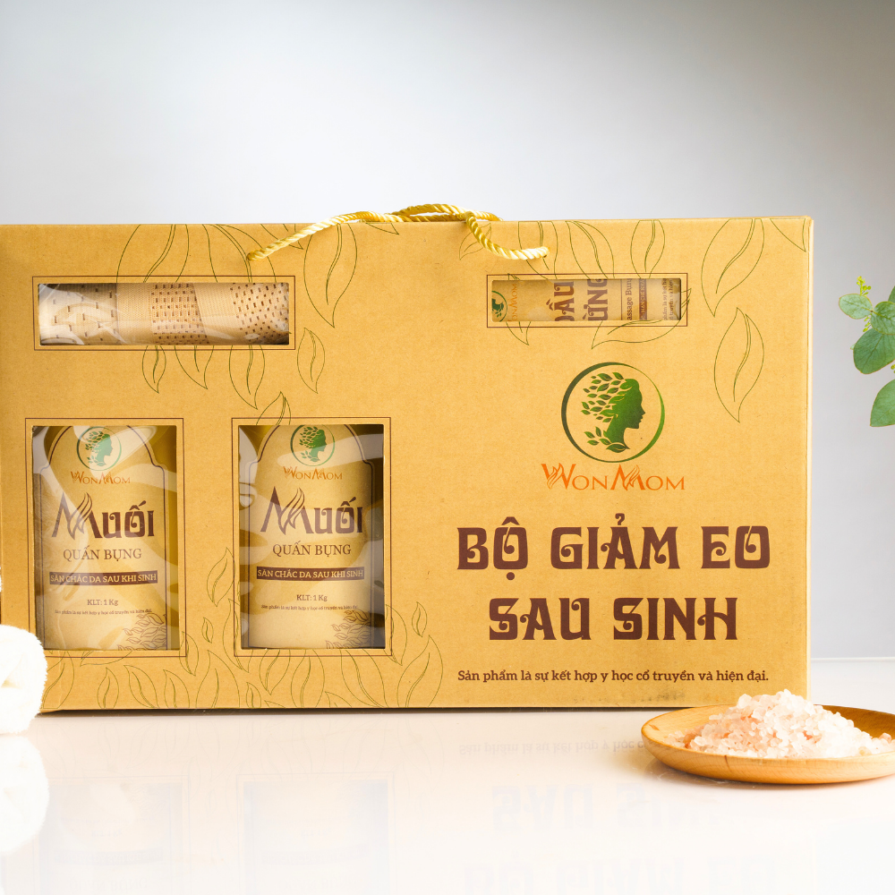 - Giới thiệu: Bộ săn eo sau sinh Wonmom gồm: 4 hộp muối quấn bụng, 1 chai dầu gừng, 1 đai quấn muối và 1 gen nịt bụng.
