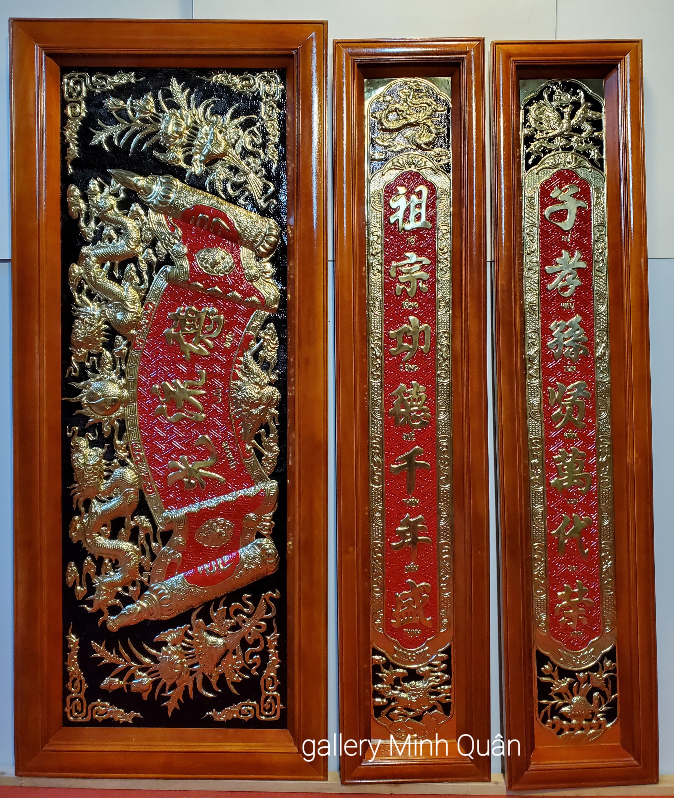 Bộ hoành phi câu đối thờ gia tiên Chất liệu: Đồng vàng nguyên chất liền tấm, được chế tác chạm khảm hoàn toàn thủ công rất sắc nét. Khung tranh gỗ dổi sơn pu cao cấp, mặt tranh lồng meca Bộ 01 Kích thước phủ khung tấm hoành phi 65cm rộng 180cm 1 tấm Kích thước phủ khung cặp câu đối cao 175cm rộng 31cm 2 tấm Bộ 02. Kích thước phủ khung tấm hoành phi 63cm rộng 153cm 1 tấm Kích thước phủ khung cặp câu đối 152cm rộng 30cm 2 tấm Bộ 03. Kích thước phủ khung tấm hoành phi 60cm rộng 136cm 1 tấm Kích thước phủ khung cặp câu đối 133cm rộng 30cm 2 tấm