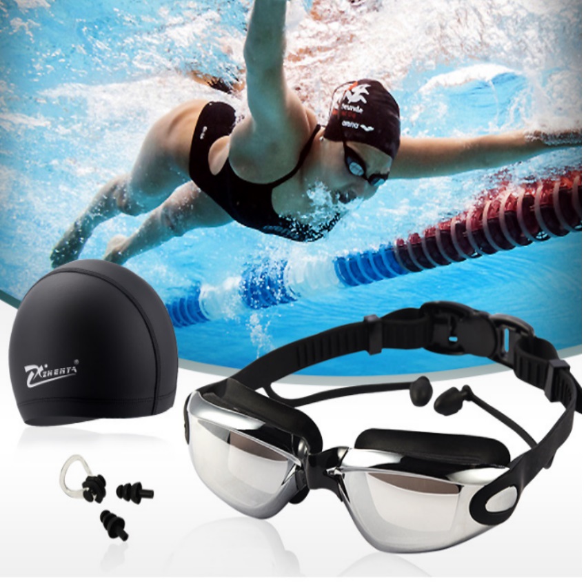 Mô tả sản phẩm Bộ kính bơi tráng gương cao cấp chống dính nước + mũ + bịt tai 206452