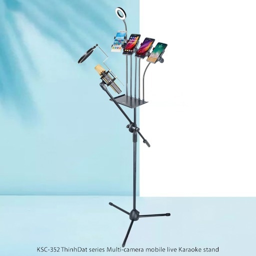 Bộ gồm 4 giá đỡ điện thoại, 1 giá đỡ micro, 1 lọc mic, 1 đèn led - Kẹp điện thoại 360 độ quay được MỌI GÓC giúp bạn chọn được GÓC QUAY ĐẸP, có thể livestream 4 điện thoại cùng 1 lúc - Đèn chiếu sáng với 3 chế độ làm sản phẩm ĐẸP LUNG LINH, còn bạn thì nổi bật như MINH TINH. Đèn có công suất sáng phù hợp trong khoảng cách gần (Đèn được thiết kế để bàn) đảm bảo giúp bạn lên hình ĐẸP NỔI BẬT, chất lượng hình ảnh SẮC NÉT. - Bộ phận chân đỡ vững chắc, có thể đặt trên mọi mặt phẳng mà điện thoại KHÔNG BỊ RUNG LẮC. - có giá để mic thu âm quá tiện cho các bạn thu âm tại nhà - Tích hợp nhiều chức năng như tăng giảm ánh sáng,thay đổi màu sắc ánh sáng (Có 3 chế độ Vàng, trắng, vàng pha trắng.) để việc livestream trở nên DỄ DÀNG và HIỆU QUẢ. - Đèn led mini - hỗ trợ ánh sáng - chụp hình - livestream - tiện lợi cho việc mang đi xa - Gọn gàng dễ dàng tháo lắp. Mô tả : Bộ livestream KAKU KSC-352 cao 190cm gồm 4 giá đỡ điện thoại, 1 giá đỡ micro, 1 lọc mic, 1 đèn 40 led 3 chế độ sáng.