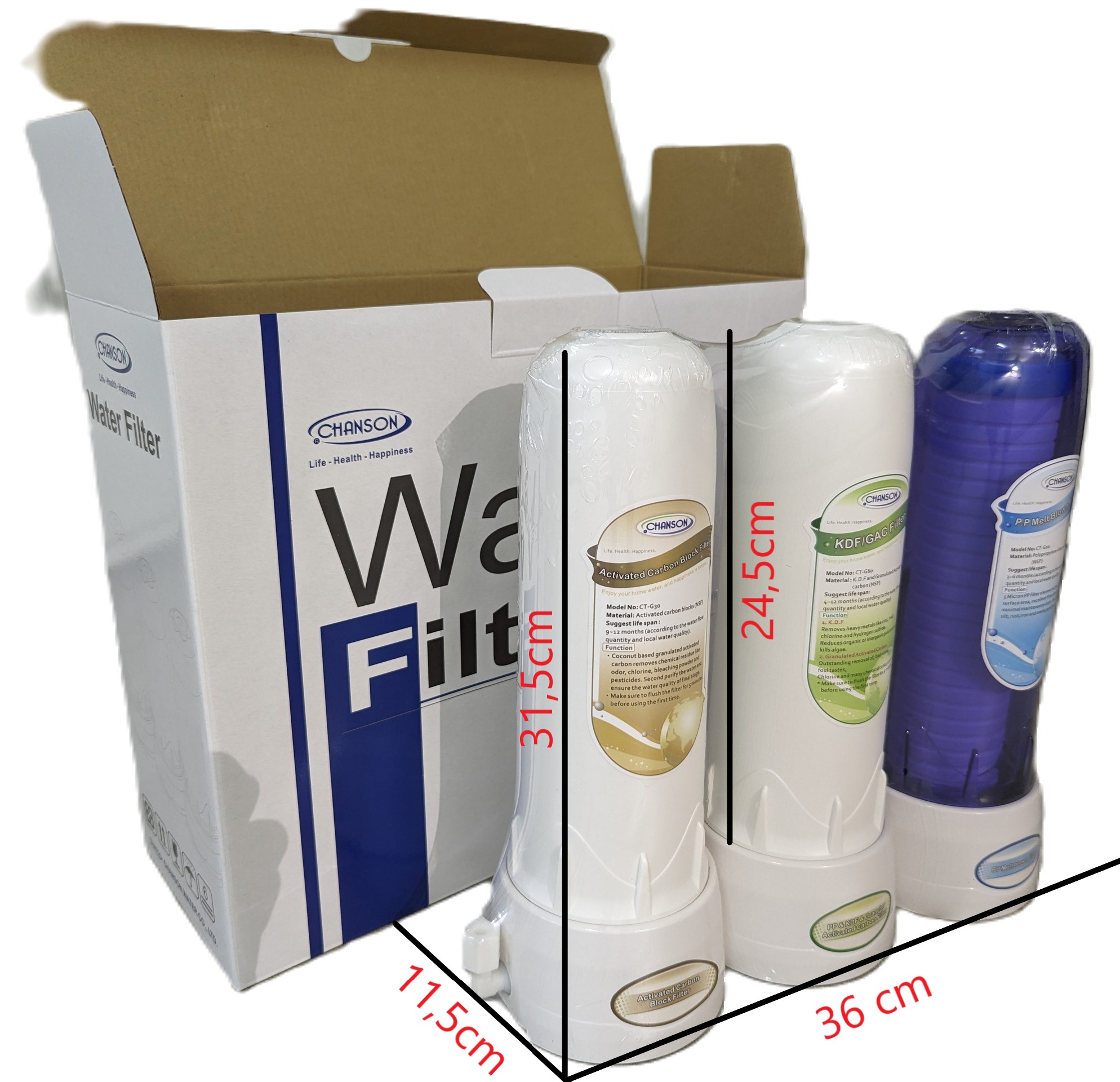 - CT-G30: Than hoạt tính dạng hạt (đạt chuẩn NSF) tăng khả năng hấp thụ các tạp chất kích thước siêu mịn, loại bỏ tàn dư hóa chất, mùi, vị tạp chất, chất tẩy, thuốc trừ sâu, … Tuổi thọ: 9 - 12 tháng, tùy lượng nước dùng hoặc chất lượng nước đầu vào. [II] Thông số kỹ thuật: