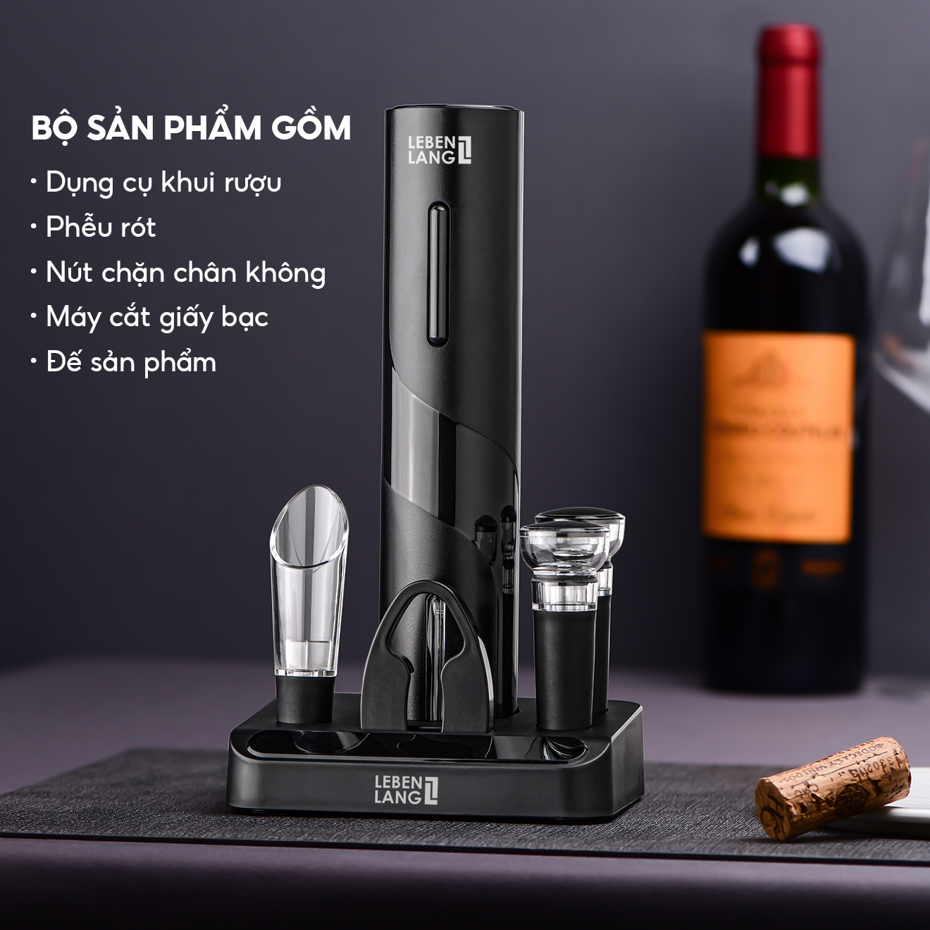 - Bộ mở rượu vang điện Lebenlang LBL2021 là phụ kiện không thể thiếu cho bất kỳ tín đồ rượu vang nào, mang lại sự tiện lợi tối đa với thiết kế không dây, dùng pin sạc