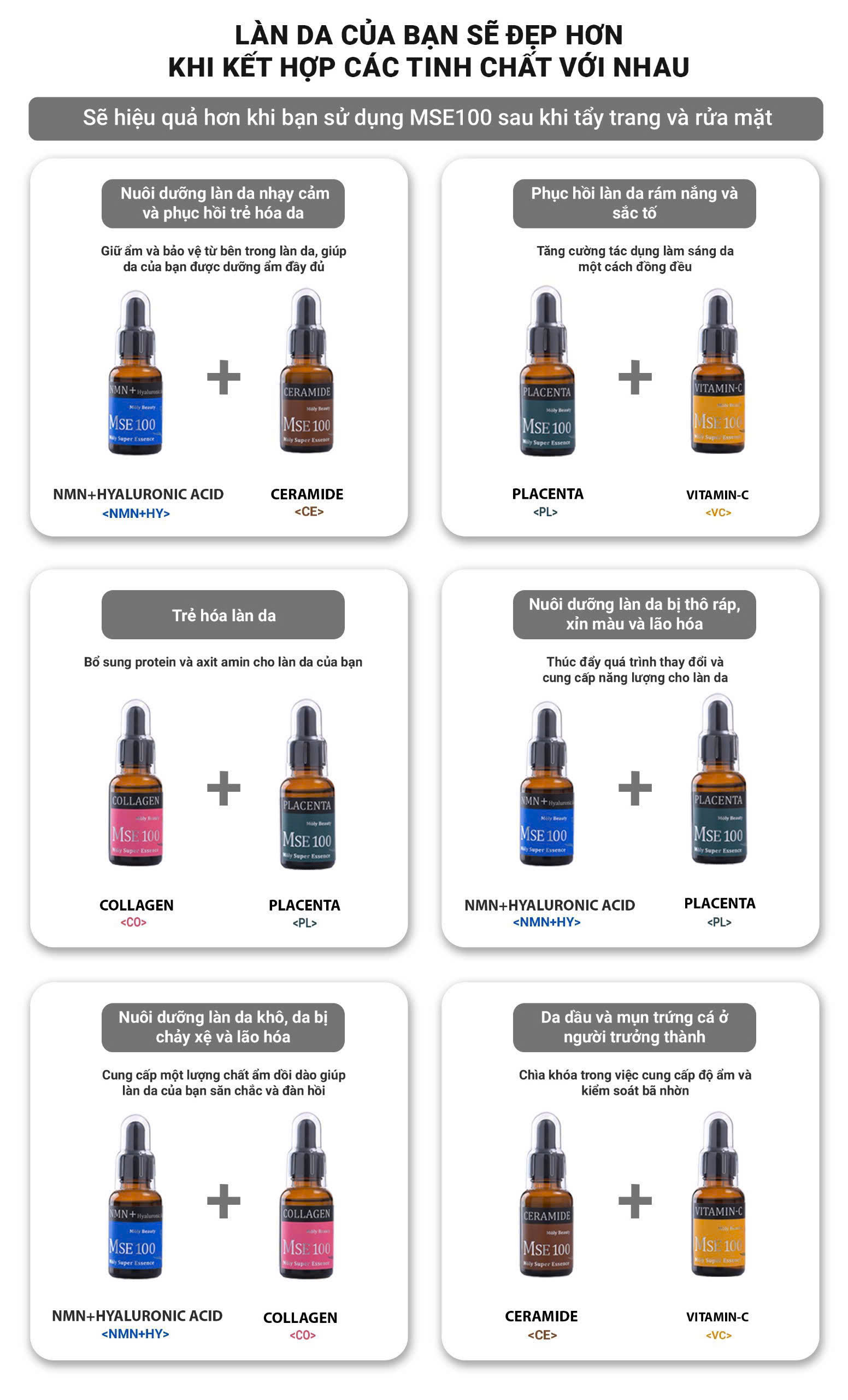 MÔ TẢ: Bộ quà tặng MSE100 tinh chất phục hồi trẻ hóa da NMN+HY 30ml+ MSE100 tinh chất nuôi dưỡng da nhạy cảm Ceramide 30ml - Mōly Beauty Thương hiệu: Mōly Beauty Quy cách: 30ml