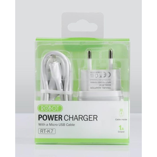 Bộ Sạc Cốc Sạc Dây Sạc ROBOT RT-K7U Cáp Micro 1m - Model: RT-K7U - Điện áp: 5V/1A - Công suất: 5W - Kèm cáp micro 1m Tính năng: Thiết kế nhỏ gọn. Sạc an toàn, tự động nhận biết điện áp phù hợp với thiết bị. Nhiều lớp bảo vệ thông minh trong quá trình sạc. Tương thích với các dòng điện thoại thông dụng hiện nay. Chất liệu chống cháy. Dải điện áp rộng 110 - 240V, phù hợp sử dụng ở nhiều quốc gia. Shop xin cam kết với hàng bán: Shop hỗ trợ miễn phí 1 lượt ship (Từ Cần Thơ đến người mua) gửi trả bảo hành nếu sản phẩm bị lỗi trong 1 tháng đầu tiên. Đúng thông số kỹ thuật, bao đổi trả hoàn tiền 100% giá trị sản phẩm nếu quý khách không hài lòng về chất lượng sản phẩm sau khi test thử trong vòng 48h! Hàng mới bảo đảm fullbox mới 100%. Sản phẩm mới mua về nếu Quý Khách chưa sử dụng được vui lòng liên hệ để Shop