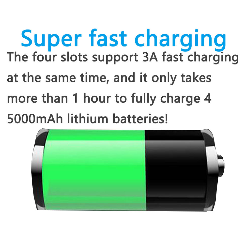 Features: Widely compatible with a variety of battery models, the battery compartment is retractable, suitable for all sizes of batteries. 4 charging slots, intelligent independent charging management, no interference, automatic power off when fully charged.