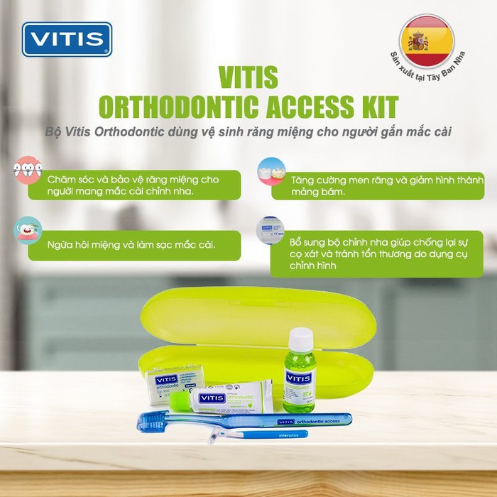 - Bộ kit Vitis Orthodontic với các thành phần hoạt tính và dụng cụ cần thiết hàng ngày giúp duy trì sức khỏe răng miệng lành mạnh, không mảng bám, nướu khỏe mạnh, hơi thở thơm mát, và ngăn ngừa sâu răng, giúp người đeo khí cụ chỉnh nha duy trì vệ sinh răng miệng hàng ngày.
