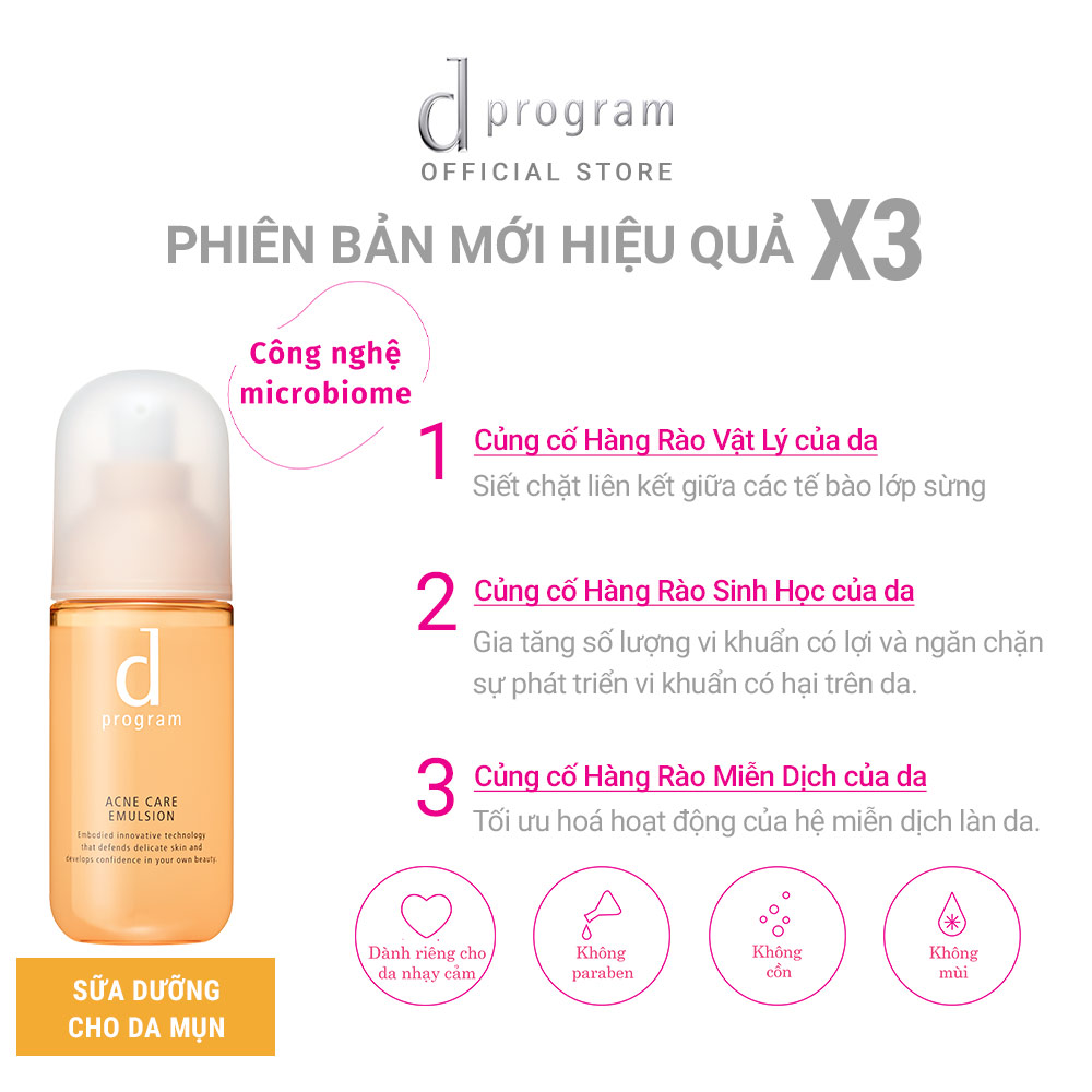 - Sữa Dưỡng Cho Da Mụn Nhạy Cảm d program Acne Care Emulsion 100ml Mô tả sản phẩm: 1/ Nước cân bằng Acne Care Lotion phiên bản mới bổ sung Công nghệ Microbiome giúp củng cố đề kháng cho da nhạy cảm X3 lần đồng thời cải thiện tình trạng mụn ẩn/đầu đen/trứng cá và giảm thâm mụn sau 4 tuần. 2/ Sữa dưỡng Acne Care Emulsion phiên bản mới bổ sung Công nghệ Microbiome giúp củng cố đề kháng cho da nhạy cảm X3 lần đồng thời cải thiện tình trạng mụn ẩn/đầu đen/trứng cá và giảm thâm sau mụn hiệu quả. Công nghệ nổi bật: