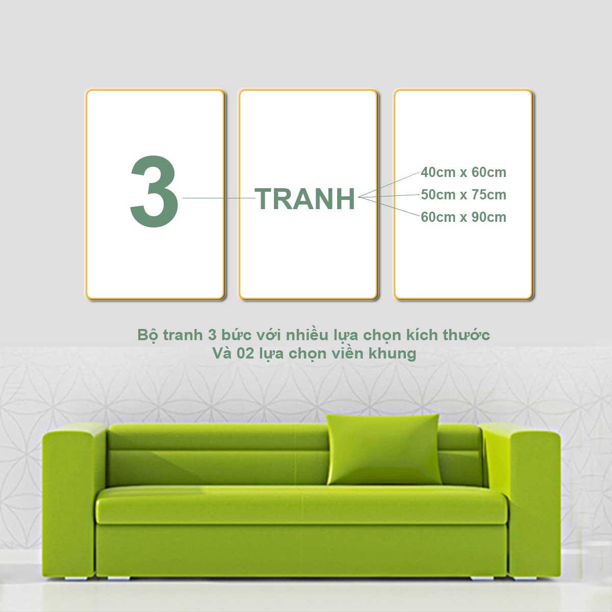 - Bộ tranh gồm 3 Bức tranh với kích thước tranh 40 x 60cm; 50 x 75cm; 60 x 90cm theo lựa chọn của Qúy khách hàng.