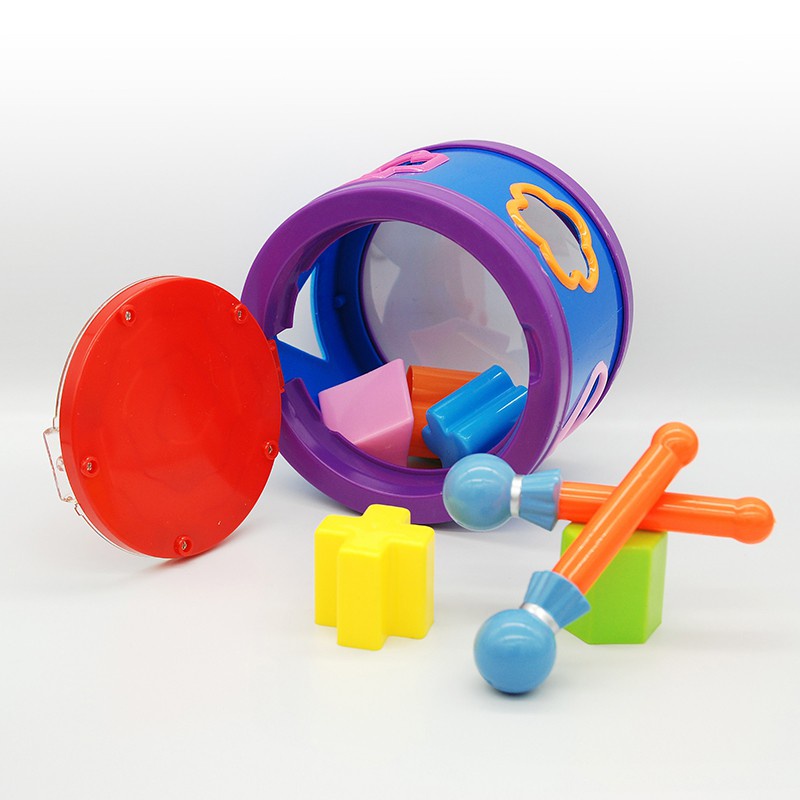 Xung quanh trống có các bên có các ô để bé thả các hình khối khác nhau : hình vuông, hình tam giác, hình tròn. Mỗi hình có một màu sắc khác nhau.