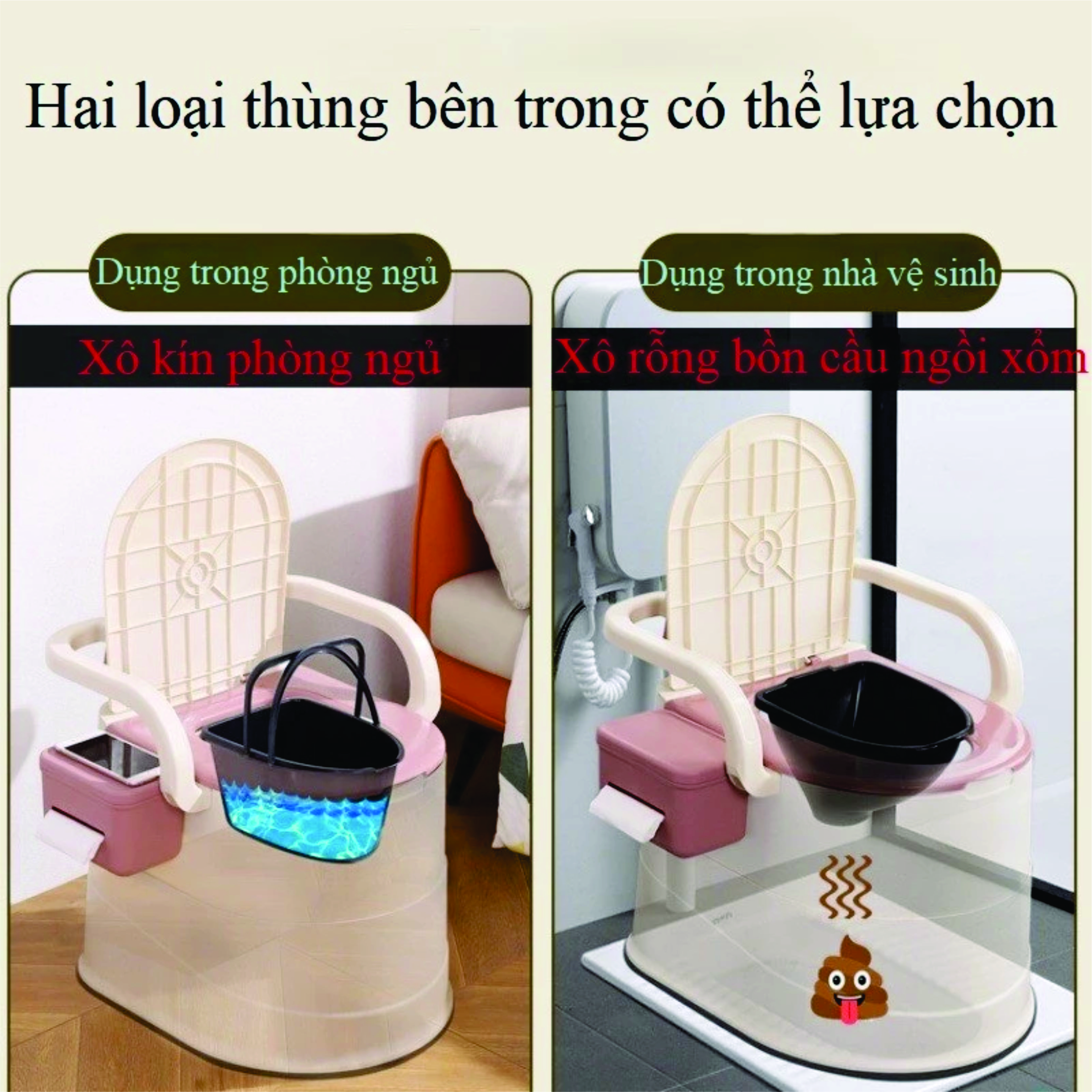 Chất liệu: đệm PU, PP Bô vệ sinh có thể di chuyển mọi nơi