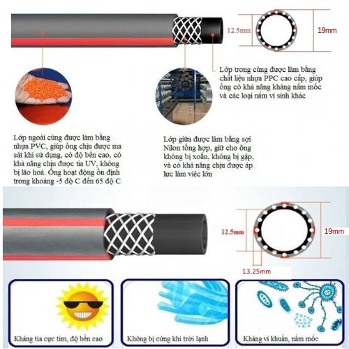 Ống kết cấu 3 lớp Chống gập, chống xoắn ống Không bị cứng ống khi thời tiết lạnh Kháng tia cực tím, độ bền cao Kháng vi khuẩn, nấm mốc Có các loại 5m,10m,15m,20m,25m.... phù