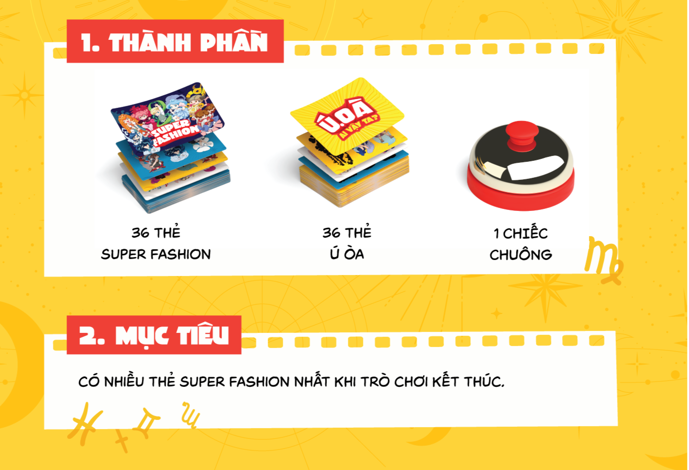 Đặt chuông, 36 thẻ Super Fashion nằm ngửa giữa bàn và tráo các thẻ Ú Òa thành 1 chồng đặt úp bên cạnh